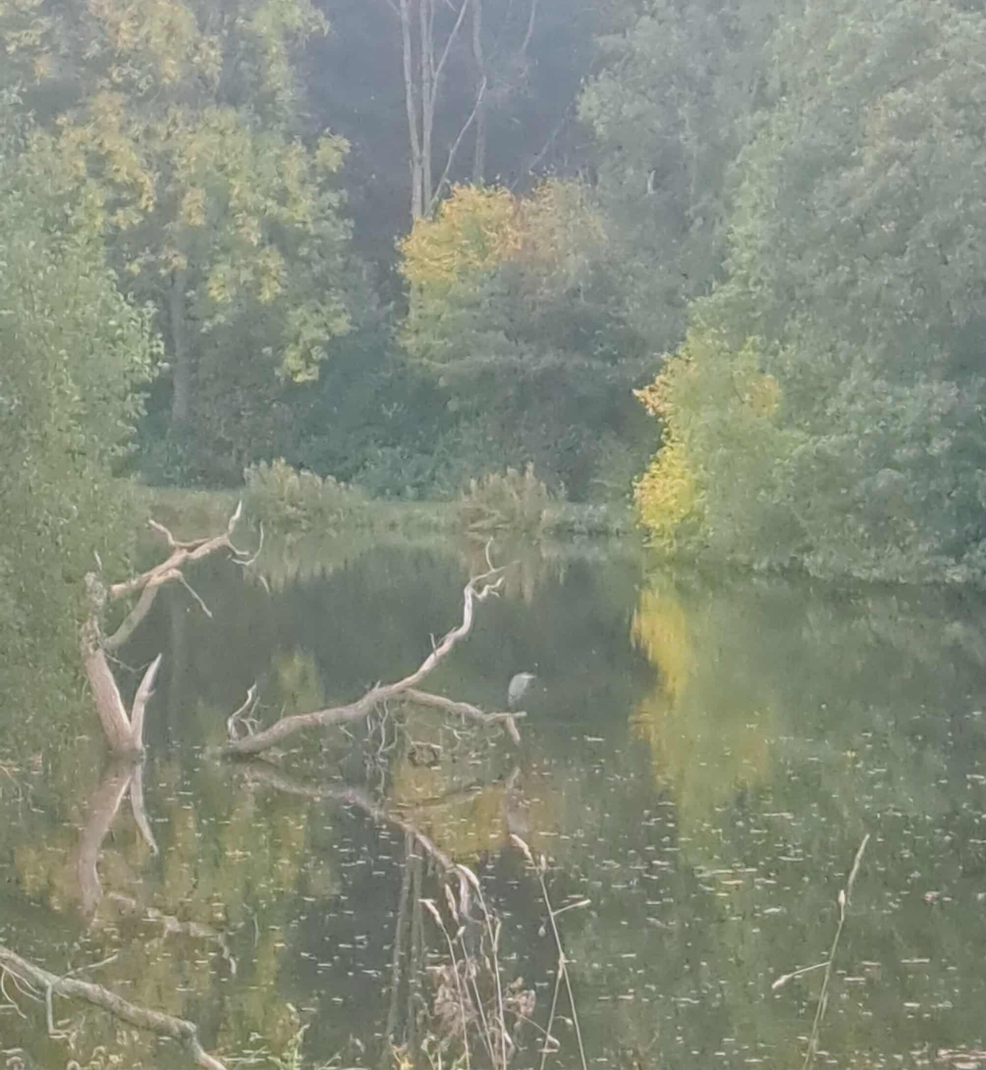 A movement catches my eye, and I look up just as Heron lifts her huge wings and takes off. With seemingly effortless flight, she glides to the edge of the lake, lands, and folding her wings settles down to feed.