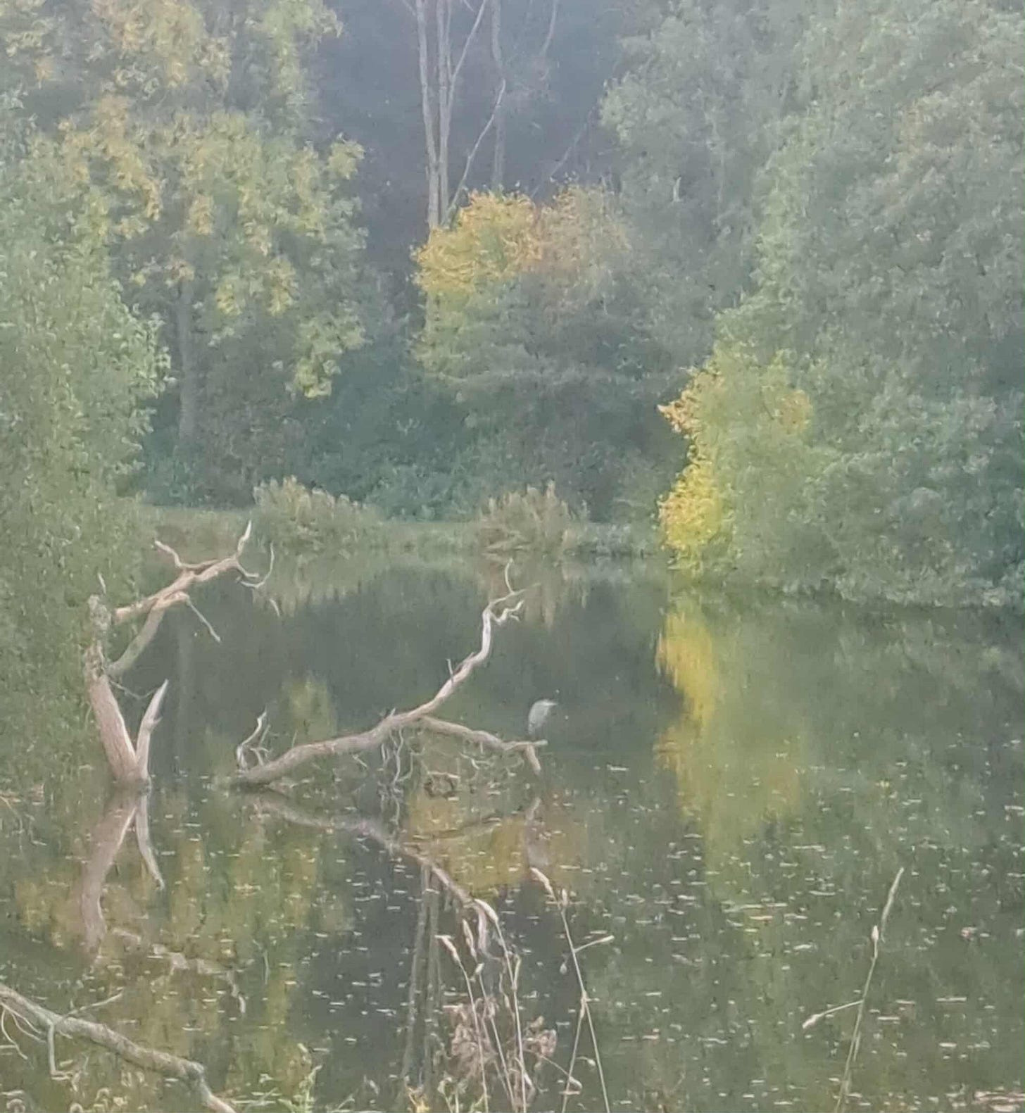 I sit staring at the blank screen of the computer, wondering what on earth I can write that is any way authentic. My eyes wander to the view outside my studio door. It is a grey misty day; all the colours are muted and subdued. In the middle of the fishing lake, a heron is perched on a fallen tree. She has been sat there all morning. I keep coming back to the computer, writing something then erasing it. Each time I look up, heron is still there.