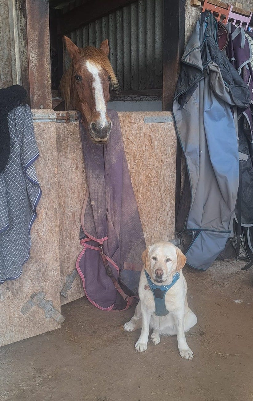 Bonny made friends with Lottie my yellow lab who would sit outside her stable when she was in for her feed, sometimes creeping in when the door was open so that she could lie with her.